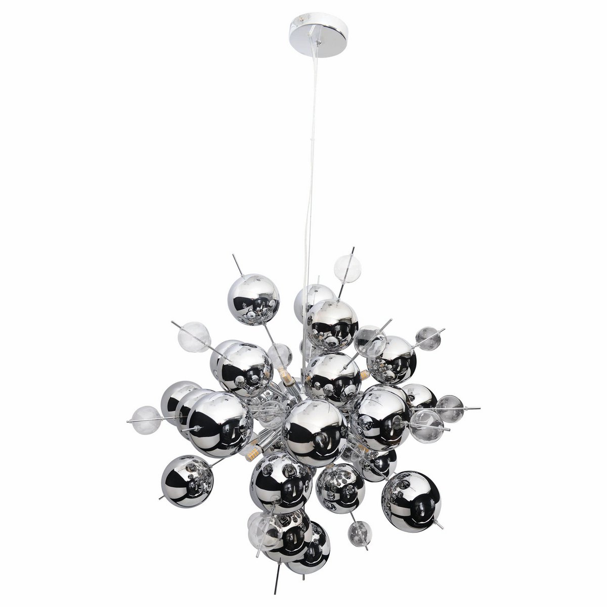 Explosion viseća lampa s kromiranim i prozirnim staklenim kuglama 65 cm pravi je statement komad za interijere koji traže odvažan dizajn i upečatljiv vizualni efekt. Njezina razigrana kompozicija kugli stvara dojam pokreta i lakoće, kao da se svjetlosni elementi šire prostorom u elegantnoj eksploziji forme. Kombinacija sjajnih kromiranih i prozirnih staklenih kugli daje ovoj lampi suvremen, luksuzan i vrlo dekorativan karakter. Posebno lijepo dolazi do izražaja iznad blagovaonskog stola, u dnevnom boravku, hodniku ili u prostorima s višim stropovima gdje može u potpunosti pokazati svoju skulpturalnu prisutnost. Zahvaljujući svom neobičnom obliku, ova lampa nije samo izvor svjetla, već i centralni dekorativni element prostora. Idealan je izbor za moderno uređene interijere koji žele spoj umjetničkog dojma, elegancije i originalnosti.